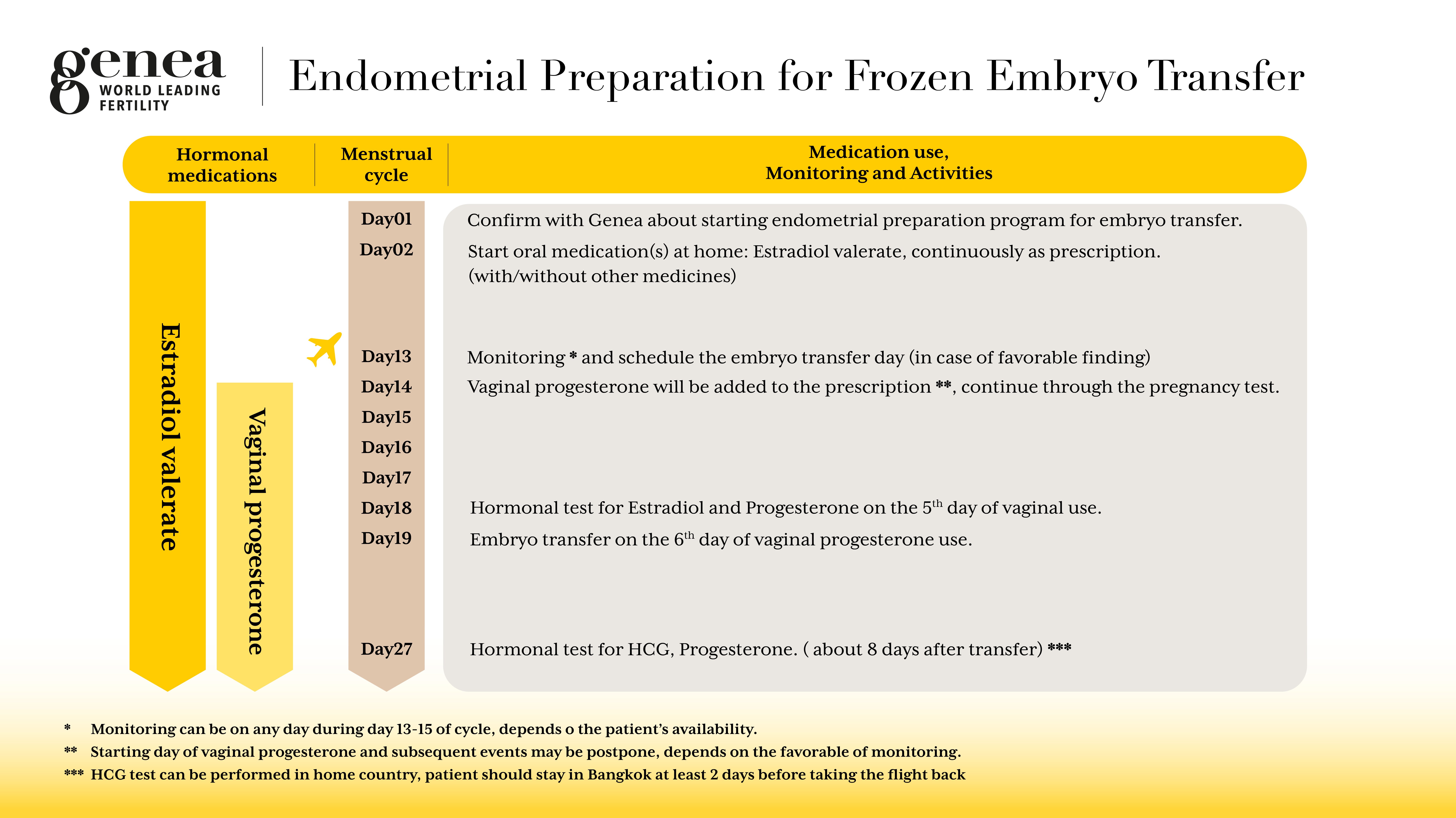 ALT: 这个时间表提供了Genea详细的冻胚移植前内膜准备流程指南。它涵盖了月经第1天至第27天的疗程安排,注明了开始使用戊酸雌二醇等激素药物及阴道黄体酮的时间。关键用药环节,包括前期患者自己在家中使用口服药物,常规监测以确定胚胎移植的最佳时间,以及增加使用阴道黄体酮步骤。时间表里注明了如激素检查及胚胎移植的这些重要时间段。这个时间线保证了患者能够了解自己的每一个治疗阶段,以提供很好的治疗配合。