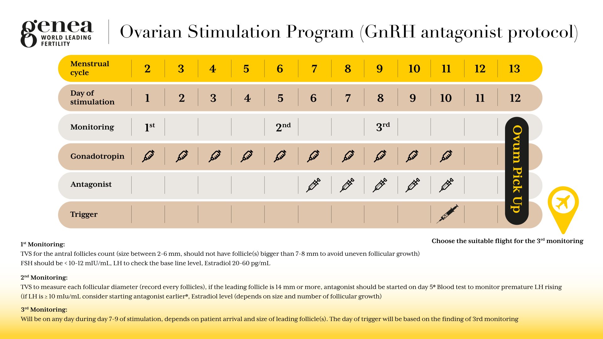 ALT: 这个时间图详细介绍了Genea的促排卵方案,在13天的月经周期内使用GnRH拮抗剂方案。它列出了每日的方案,包括检测、促排卵及拮抗剂药物的使用,及卵子采集手术前的夜针注射时间。同时它备注了卵泡监测时间段为促排第1天,第5天及第7-9天期间,这个时间图能够给患者提供具体的治疗指导。在时间表中也着重标注了第三次监测见诊的航班出行计划时间,这给国际患者在规划出行上提供便利。